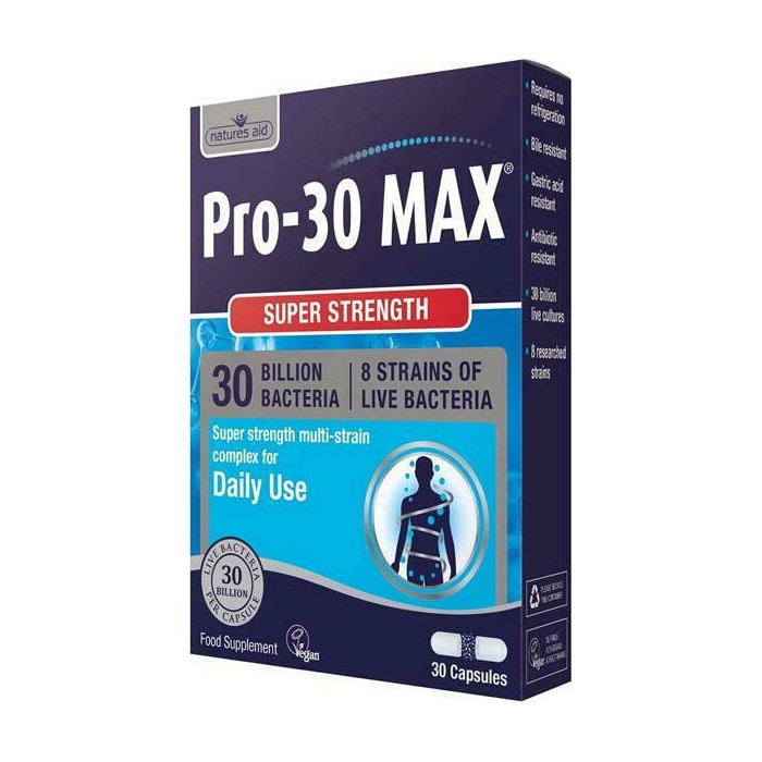 Το Natures Aid Pro-30 MAX 8 Strain Complex είναι ένα ισχυρό καθημερινό προβιοτικό συμπλήρωμα που έχει σχεδιαστεί για να ενισχύει την ισορροπία της εντερικής μικροχλωρίδας και να υποστηρίζει τη γενική προσωπική υγεία και πέψη με μία κάψουλα την ημέρα. Κάθε κάψουλα περιέχει 30 δισεκατομμύρια ζωντανούς μικροοργανισμούς από 8 επιλεγμένα στελέχη προβιοτικών βακτηρίων, τα οποία έχουν επιλεγεί ώστε να «συνεργάζονται» για καλύτερη πεπτική υποστήριξη και καθημερινή ευεξία.